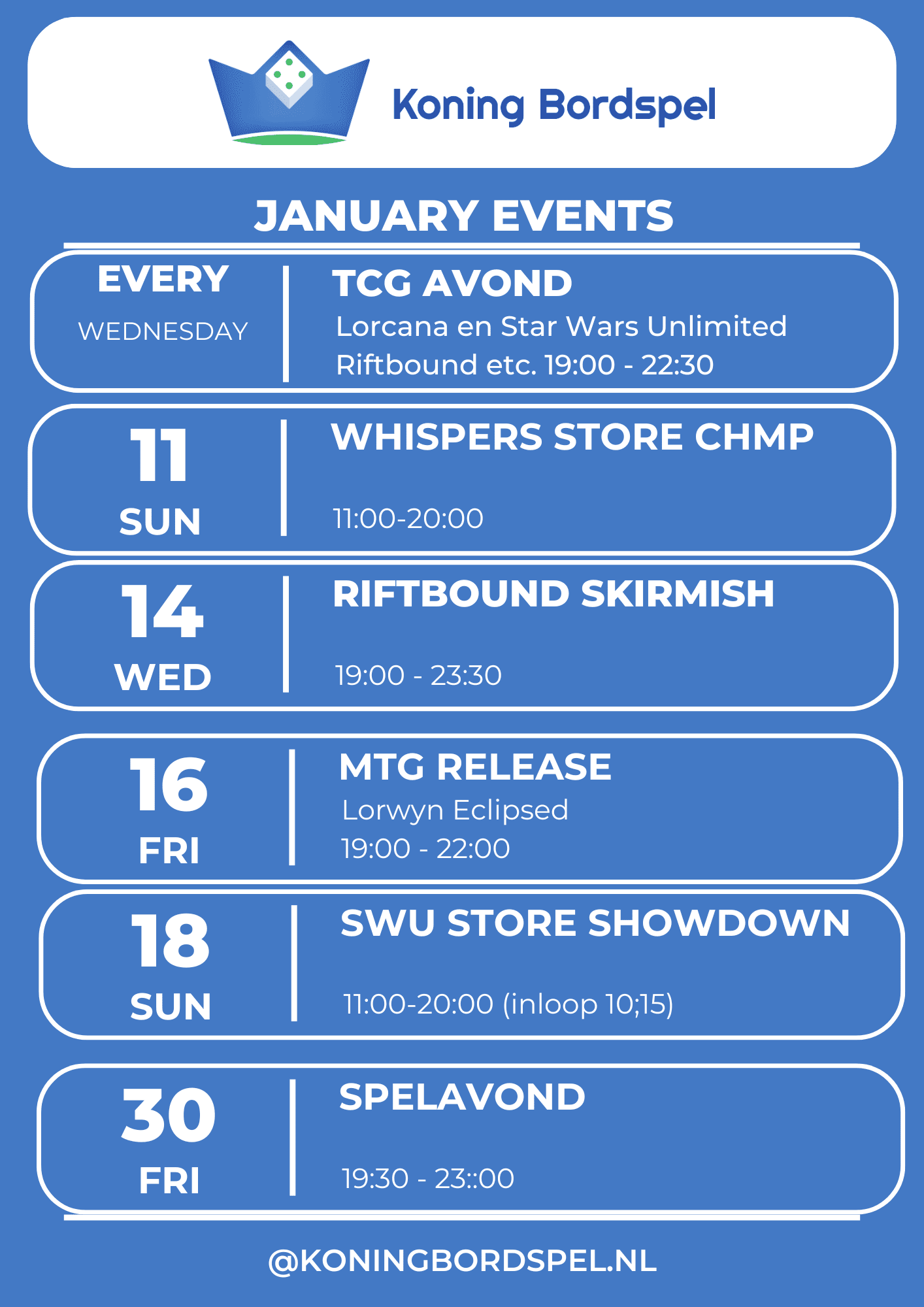 We hebben een wekelijks moment om Disney Lorcana, Riftbound en Star Wars Unlimited te spelen. Verder worden hier de data voor ons maandelijkse spelavond en andere bijzondere events bekendgemaakt.