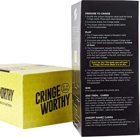 Cringeworthy is the adult party game that puts you and your friends in horrible, hilarious, NOT-suitable-for-easily-offended-ears situations. In each round, the Cringemaster reads a Situation card that sets up an open-ended scenario. Each player then chooses a Cringe card to play and reads it out loud to the group. Yes, you have to read it yourself. Got an "[Insert Name]" Cringe card? Say the name of any player other than the Cringemaster to crank up the awkwardness. Whoever makes the Cringemaster feel the most uncomfortable wins the round. Pro tip: Any card can be a winner if you sell it hard enough. Feeling brave? Play an "And then ..." Cringe card plus another Cringe card from your hand to block the win. So grab your morally compromised friends or family and get your next game night started!