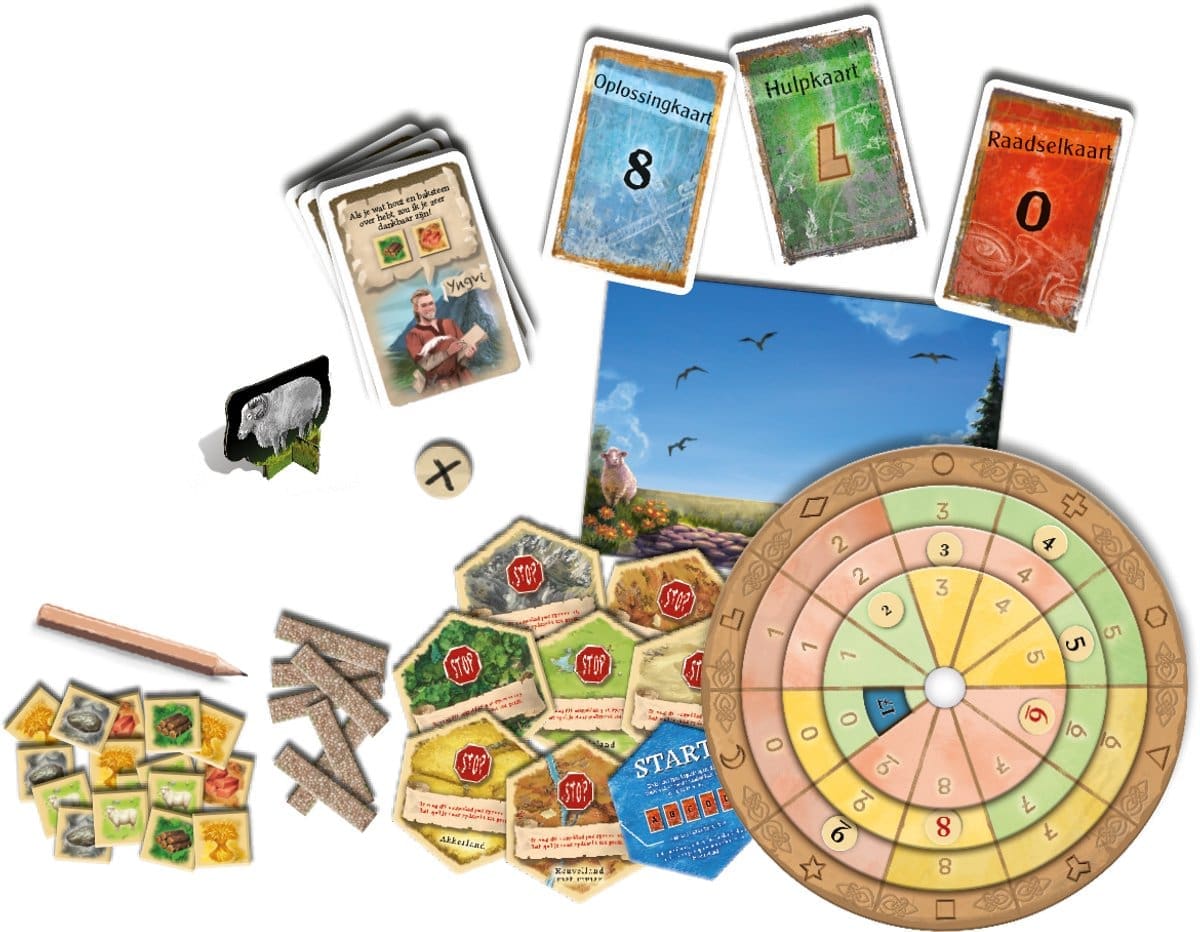 Deze escape room voor thuis bevat geen speelbord! In plaats daarvan volg je een verhaal aan de hand van verschillende kaarten. Op elke kaart staat precies welke stappen je moet volgen om verder te komen. Op sommige kaarten vind je een raadsel. Overleg en puzzel gezamenlijk om tot een driecijferige code te komen. Stel deze code op de decodeerschijf in en je komt erachter welke kaart je nu moet lezen. Hebben jullie het fout, dan helpen de hints jullie altijd aan de oplossing, zodat jullie nooit helemaal vast komen te zitten. Hoe sneller jullie alle puzzels oplossen en hoe minder hints jullie hoeven te gebruiken, hoe beter jullie eindresultaat. Weten jullie met 10 sterren het geheim van Catan op te helderen?