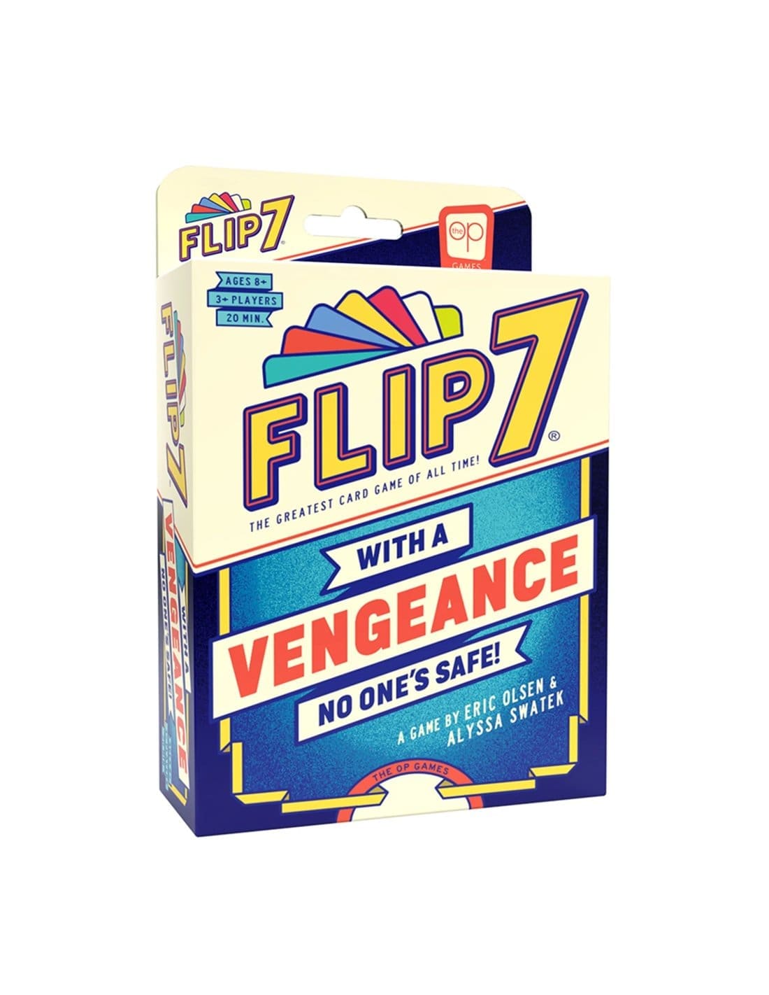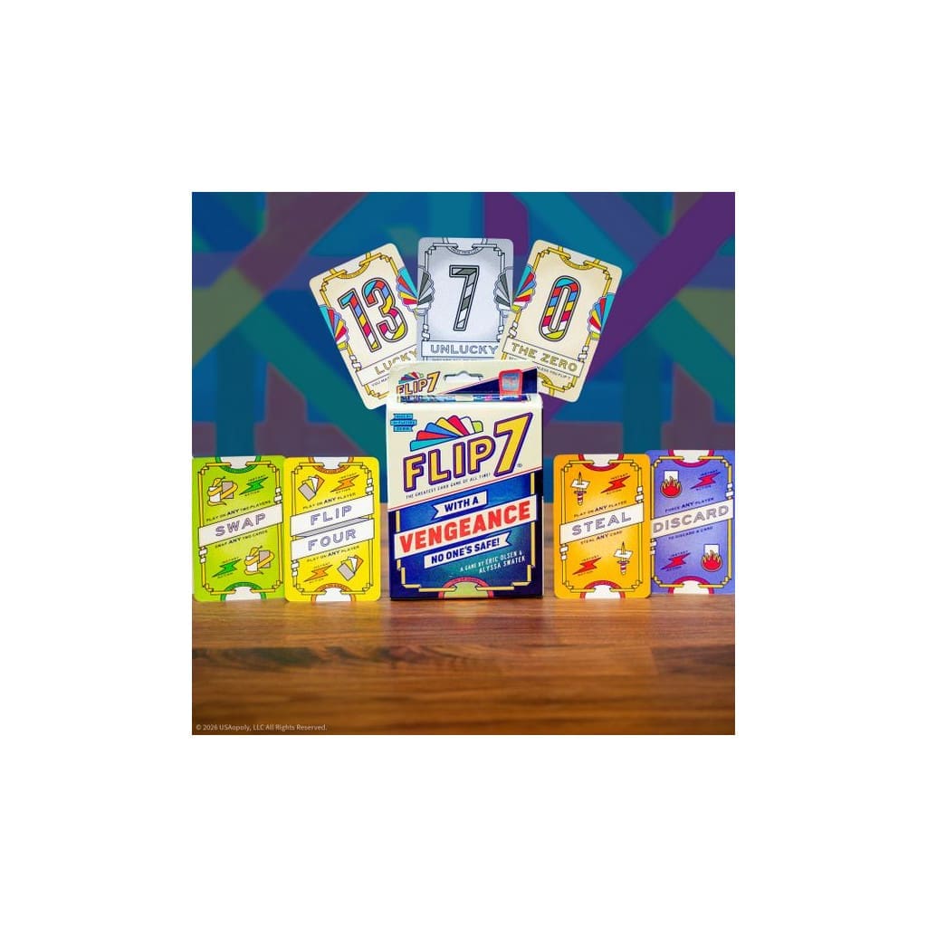 Flip 7: With a Vengeance is een op zichzelf staand vervolg dat de spanning en interactie tussen spelers naar een hoger niveau tilt. Spelers draaien kaarten één voor één om en nemen steeds opnieuw het risico om veel punten te scoren zonder een dubbel nummer te onthullen en zo te “busten”.