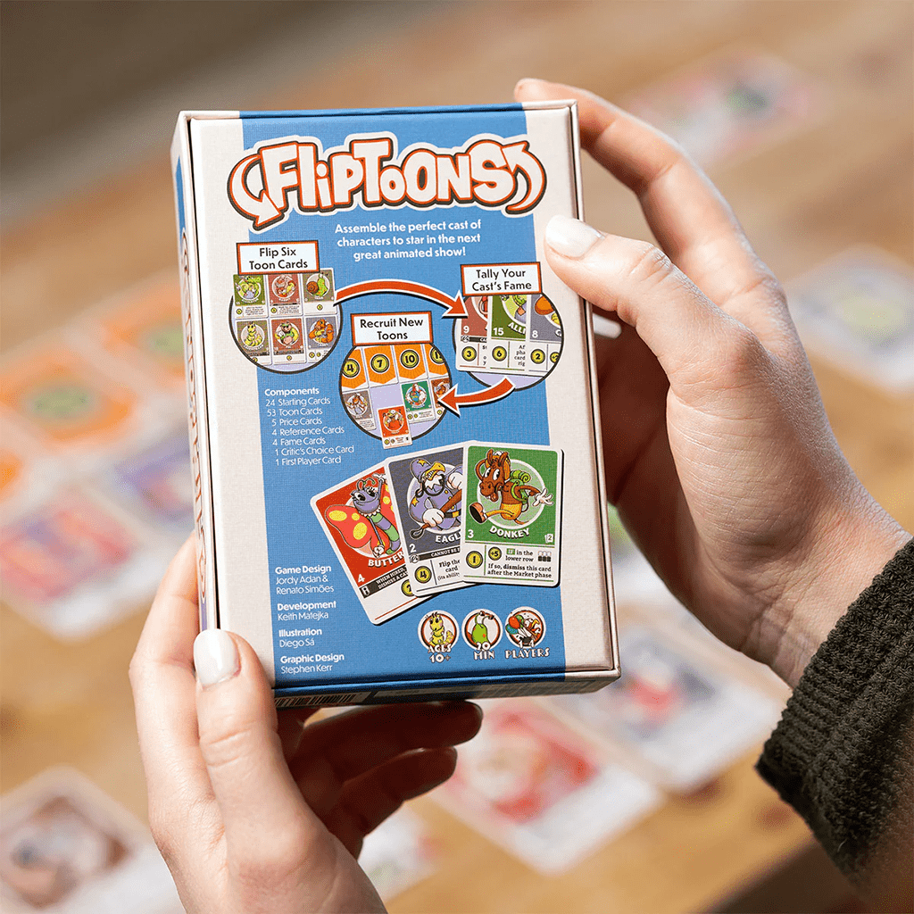 FlipToons is een snel en toegankelijk deckbuilding kaartspel voor 1 tot 4 spelers. Je begint met een deck vol aspirant-toonacteurs. Elke ronde draai je zes kaarten om en plaats je deze in een 3×2 raster, waar ze samen auditie doen. Elke kaart heeft unieke talenten: sommige effecten worden direct geactiveerd, terwijl andere kaarten elkaar versterken om extra roem te verdienen voor jouw studio.