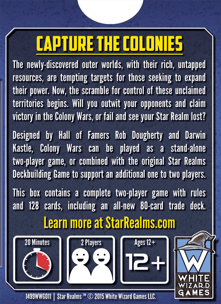 Star Realms: Colony Wars is een snelle en strategische deckbuilding kaartgame in het populaire Star Realms-universum. Deze doos bevat een compleet spel voor 2 spelers, maar kan ook gecombineerd worden met het basisspel om met maximaal 4 spelers te spelen.